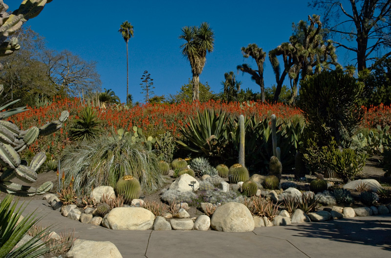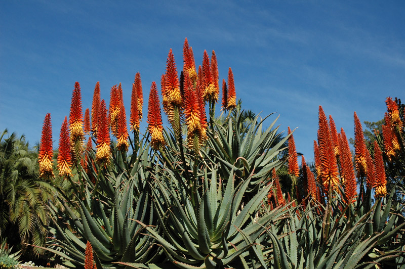 A particularly dramatic massed display of the flame-red A. arborescens can be seen right now on a hillside on the eastern side of the garden, visible from the Heritage Walk section in the lower part of the garden. Have your camera ready, because you'll want to get a shot! Other interesting species to look for are a distinctive lemon yellow variety of A. arborescens, two-toned blooms such as A. wickensii, and the candelabra-shaped (and aptly named) A. candelabrum. You can also see many cultivars that were named and introduced by The Huntington, such as A. ‘Tangerine’ and A. ‘David Verity’, which were first made available to the horticultural trade through the botanical division’s International Succulent Introductions program. And if your visit to the Desert Garden inspires you to plant a few aloes of your own, you can browse through the ISI online catalog and order Huntington introductions to grow at home.