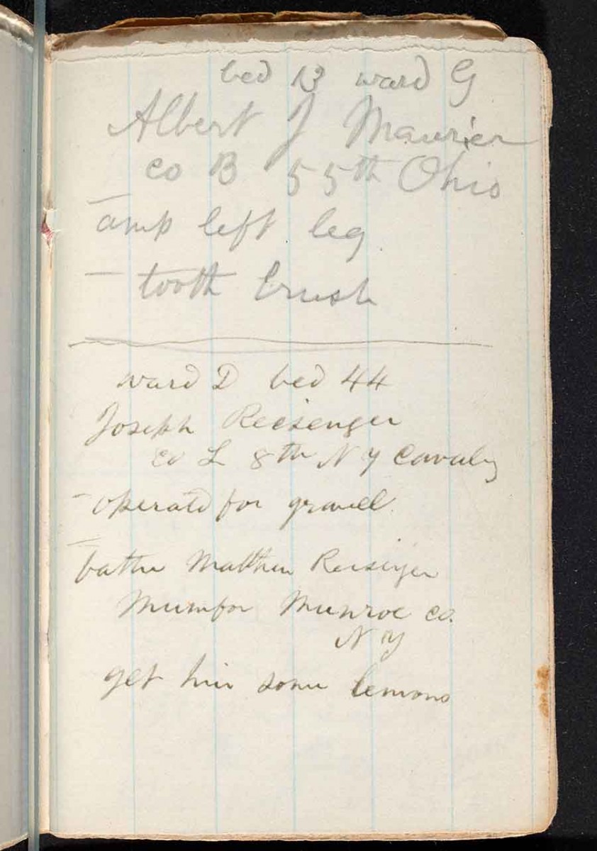 Usually Whitman jotted the ward of a particular hospital, the bed number, a soldier’s company and regiment, and often a particular thing he wanted. Sometimes the results are jolting: “bed 13 ward G / Albert J Maurier / co B 55th Ohio / amp left leg / tooth brush.” Albert was a private, too.