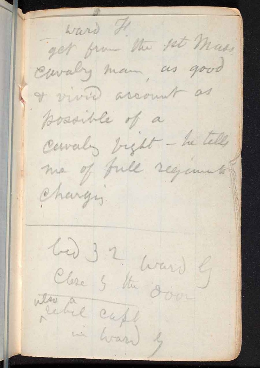 On page 7 of his hospital notebook, Whitman wrote: “ward F / get from the 1st Mass. / cavalry man, as good / + vivid account as / possible of a / cavalry fight – he tells / me of full regiments / charging.” The Huntington Library, Art Museum, and Botanical Gardens.