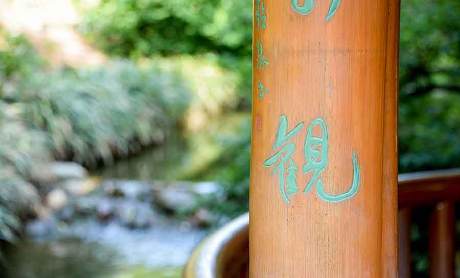 The pavilion is adorned with a simple poetic couplet engraved into bamboo boards. Read from top to bottom, right to left, it can be directly translated to read: