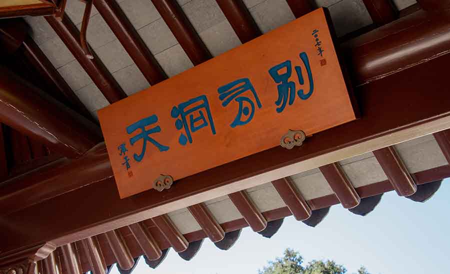 Stepping through the main doorway to the garden, the visitor is greeted by a wooden placard that reads: “Bie You Dong Tian” 別有洞天, or “Another World Lies Beyond.” Photograph by Deborah Miller.
