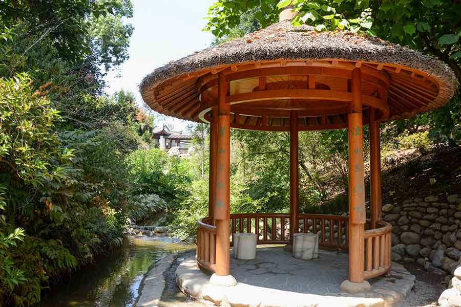 Although Liu Fang Yuan as a whole can be seen as a space separated from the mundane world  of daily life, its embodiment of the reclusive ideals so celebrated in premodern gardens is perhaps most palpable in the Pavilion for Washing Away Thoughts (Di Lü Ting 滌慮亭). This small, open-air thatched hut is hidden among the oaks and camellias that line the stream connecting the Chinese and Japanese Gardens. Its name draws inspiration from a memorial that Liu Zongyuan 柳宗元 (773–819), a well-known poet and essayist of the Tang dynasty, offered in thanks to the emperor for his gift of mind-clearing tea.