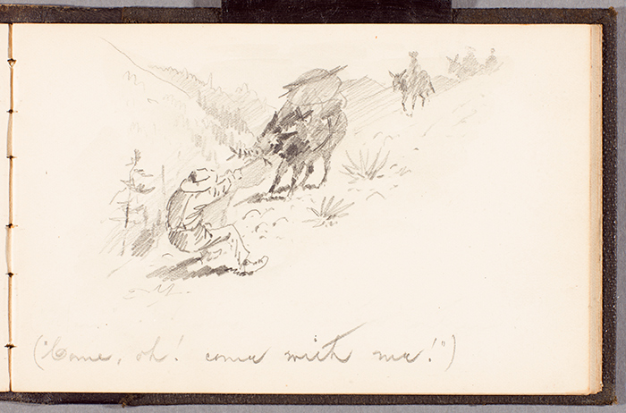 Percival’s sketches document whimsical details of camp: the wooden chair she describes as “after Louis XV,” a rustic stone and pipe stove, a ham hanging in a tree, and the banjo music that served as evening entertainment. In pencil and watercolor, she depicts the trail with its burro riders and pack mules. She also captures the humor of the trip, for instance in a sketch titled “Come, oh! Come with me!” showing a determined camper pulling a recalcitrant mule.