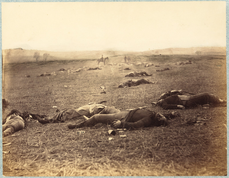 Timothy H. O'Sullivan (ca. 1840–1882), photographer; printed by Alexander Gardner, A Harvest of Death, Gettysburg, July 4, 1863; Albumen print; 7 x 9 in. Huntington Library, Art Collections, and Botanical Gardens.