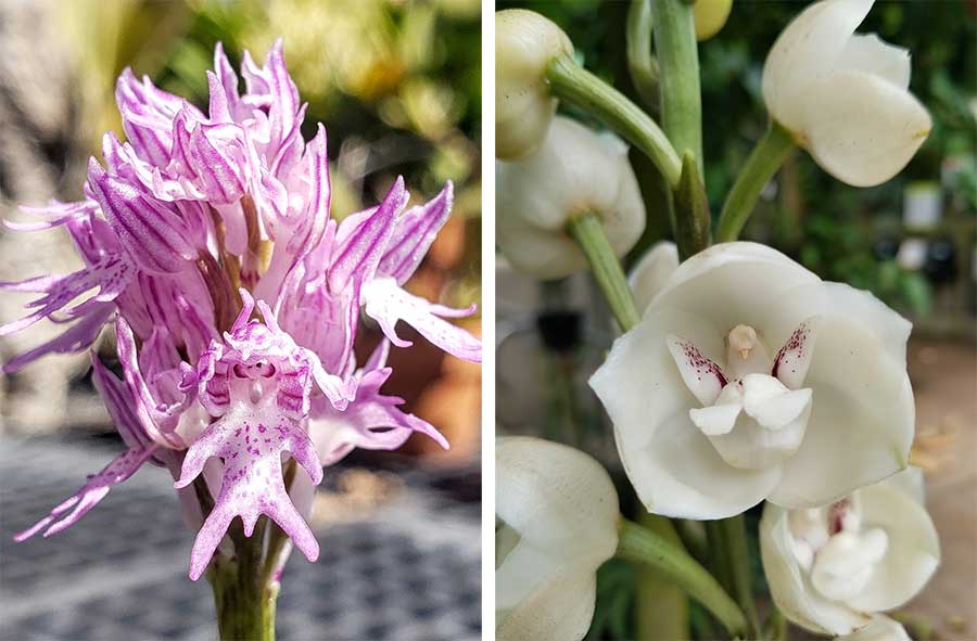 Left: Orchis italica is found in coastal areas of the Mediterranean from Israel to Spain. The anthropomorphic shape of the lower lip of its flowers inspires the common name, naked man orchid. Right: The blooms of Peristeria elata do indeed resemble the birds that inspire the species common name, dove orchid. It is found in shaded grassland edges and stone outcrops in the tropical forests of Central and South America. Photos by Brandon Tam.