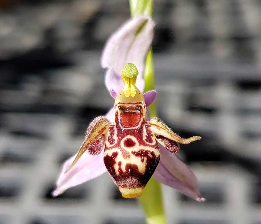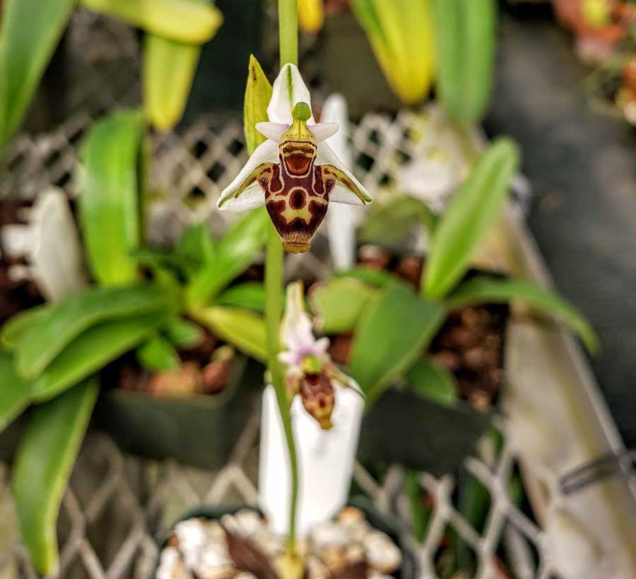 “People are surprised to find out that orchids are found on every continent in the world except Antarctica,” comments Huntington Orchid Collection Specialist Brandon Tam. “Even though our collection is incredibly diverse, it dawned on me one day that we had orchids representing every continent except Europe. To further illustrate the diversity of orchids around the world, we made it our goal to have this continent represented through the genus Ophrys. Though members of this genus are incredibly easy to grow outdoors in Southern California, they are difficult to find in cultivation within the United States.”