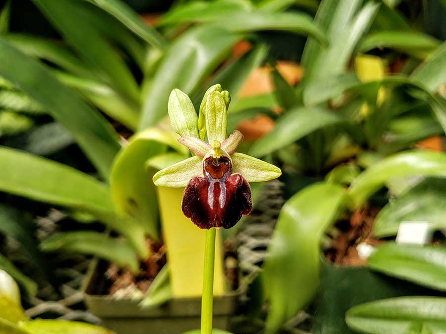 With more than 10,000 orchid plants, The Huntington’s orchid collection is one of the largest in the United States, and one of the five most diverse collections in the world, with more than 3,600 unique varieties, representing more than 1,500 species and 2,000 hybrids, across 280 genera. In summer 2020, two groups of bee orchids arrived at The Huntington, purchased from a Florida-based grower who continuously imports them from a European nursery and propagator. These new arrivals filled an important niche in the collection.