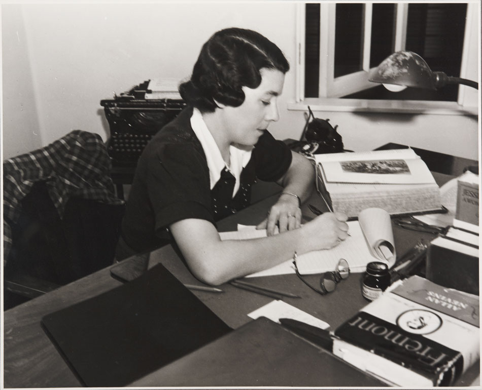 Photograph of Sonya Levien working at her desk, ca. 1933. The Huntington Library, Art Museum, and Botanical Gardens.