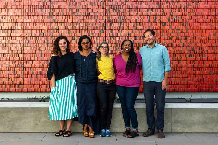 The exhibition “Beside the Edge of the World” features work by the following artists and writers (left to right): Beatriz Santiago Muñoz, Robin Coste Lewis, Nina Katchadourian, Dana Johnson, and Rosten Woo. They stand before Doyle Lane’s Mutual Savings and Loan Mural, 1964, at The Huntington. Photo by Kate Lain. The Huntington Library, Art Museum, and Botanical Gardens.