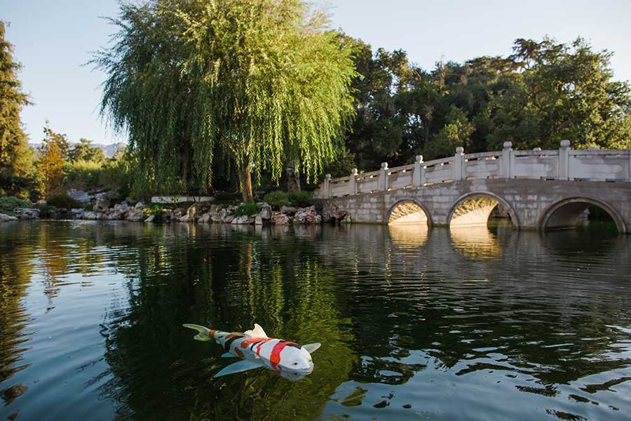 Nina Katchadourian’s “Strange Creature” swims in the Lake of Reflected Fragrance in The Huntington’s Chinese Garden, Liu Fang Yuan 流芳園. Photo by Gina Clyne.