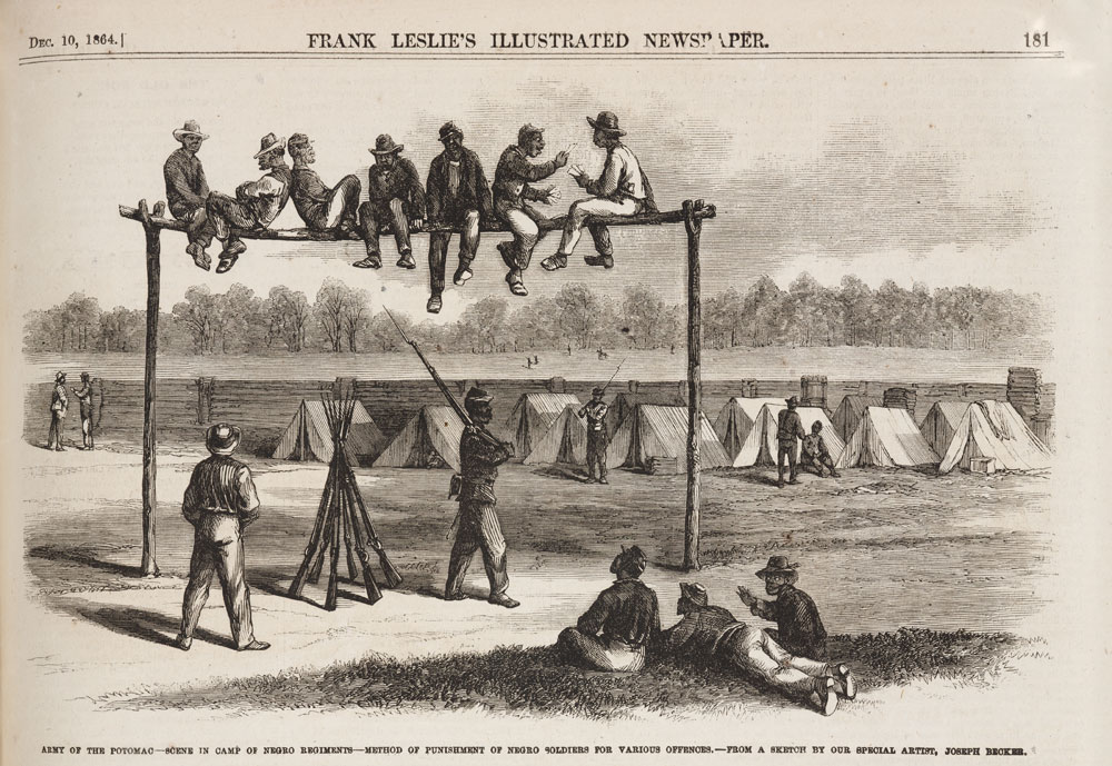 This photograph and illustration depict the same scene—black soldiers undergoing punishment on the "wooden horse." The illustration comes from Frank Leslie's Illustrated Newspaper (Dec. 10, 1884), and the illustrator assures that his "drawing is from life...and brings the truth vividly to the spectator's mind." The author of the corresponding article uses the image to support the claim that the "obtuse sensibilities" of "negro troops" saves them from the inherent shame in punishment, and controlling them required far more force than what was needed to discipline white soldiers. Meanwhile the photograph, which comes from The Huntington's James E. Taylor collection of Civil War images, captures just two soldiers straddling the suspended beam with stoic faces (this in contrast to the newspaper's illustration, which shows many more soldiers, some playing cards while others nap).