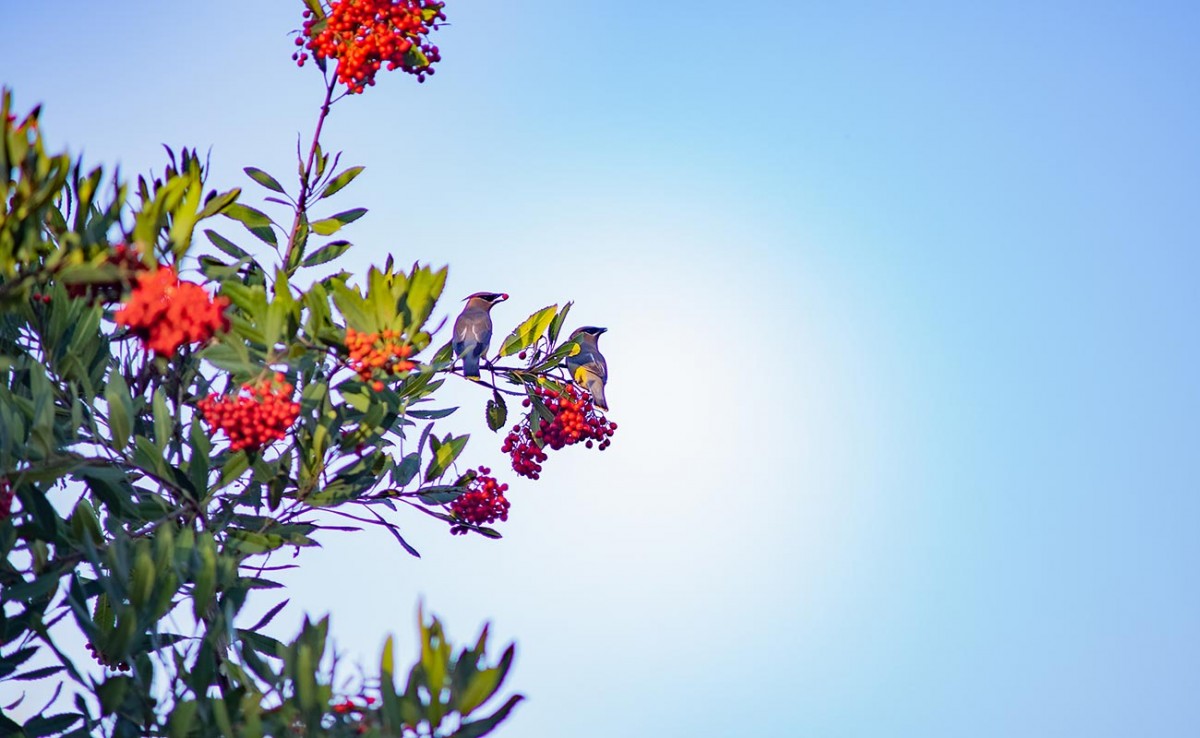 green and red toyon bush and grey cedar waxwing birds
