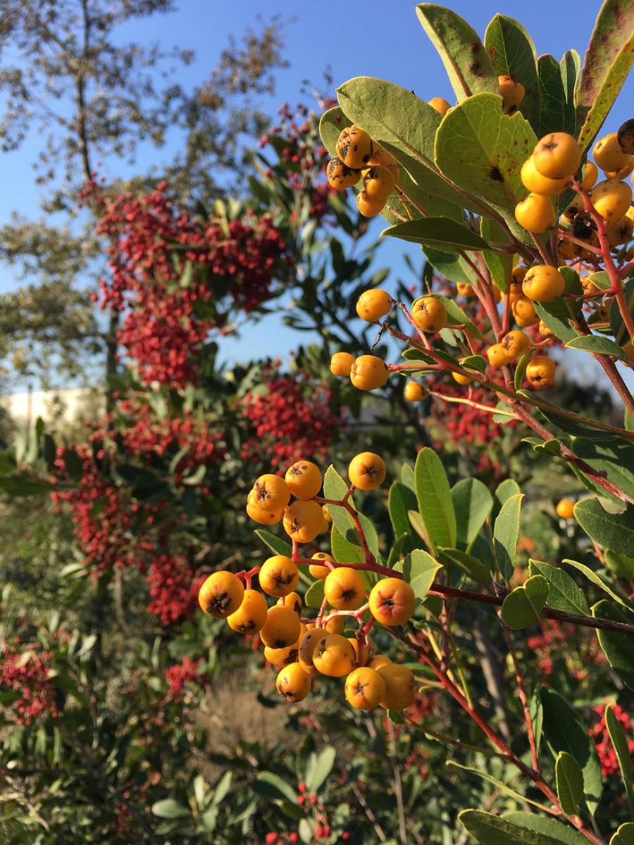 After some yellow-fruiting toyons were discovered in wild populations, they were brought into cultivation. This cultivar is ‘Davis Gold’. Photo by John Trager.