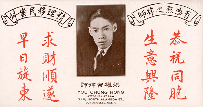 American-born You Chung (“Y.C.”) Hong (1898–1977) was one of the first Chinese Americans to pass the California Bar, and, as a prominent immigration lawyer, worked tirelessly for equal rights for Chinese Americans. His papers are the source for the recently opened exhibition "Y.C. Hong: Advocate for Chinese-American Inclusion,"on view in the West Hall of the Library from Nov. 21, 2015 to March 21, 2016.