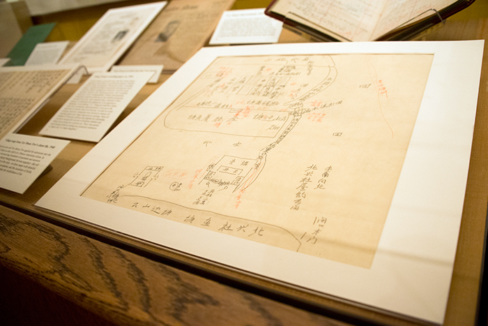 In one of the exhibition's display cases is a map produced by a 12-year-old boy showing a sketch of his home village in China. Immigration officials had the boy draw an annotated map and then used it to test relatives on who lived in each house. The Huntington Library, Art Collections, and Botanical Gardens.