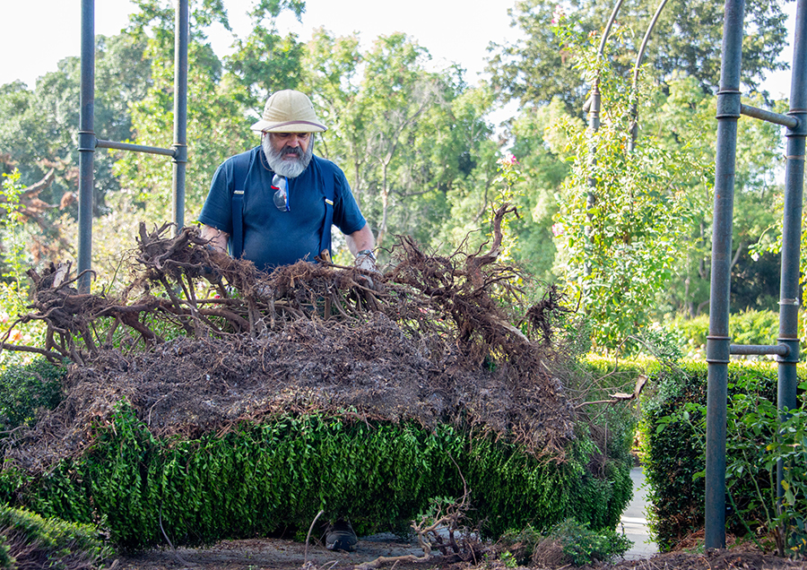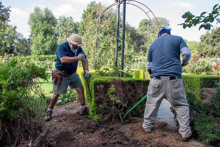 John Villarreal, the chief technical gardener of the Rose Garden, and fellow rose gardener Noel Aviña remove a myrtle hedge from the arbor path. Photo by Deborah Miller.