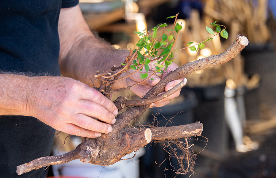 "This one is going to be stunning," he said, pointing out a trunk that stood upright but had several branches sweeping up dramatically from the trunk. "This might appear in our collections someday."