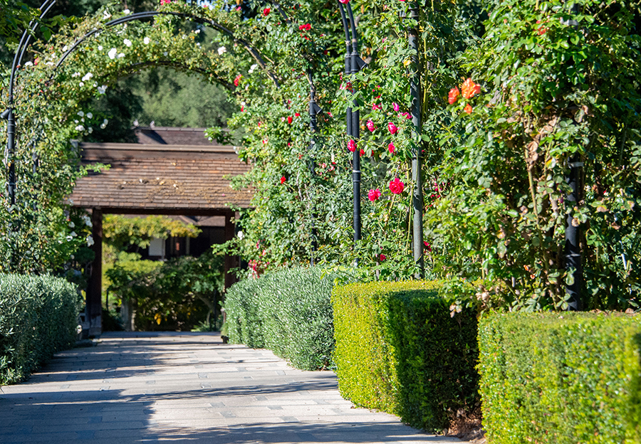 A view of the arbor path in the Rose Garden, showing the replacement dwarf olive plants in the background and the myrtle hedge in the foreground. Photo by Deborah Miller.