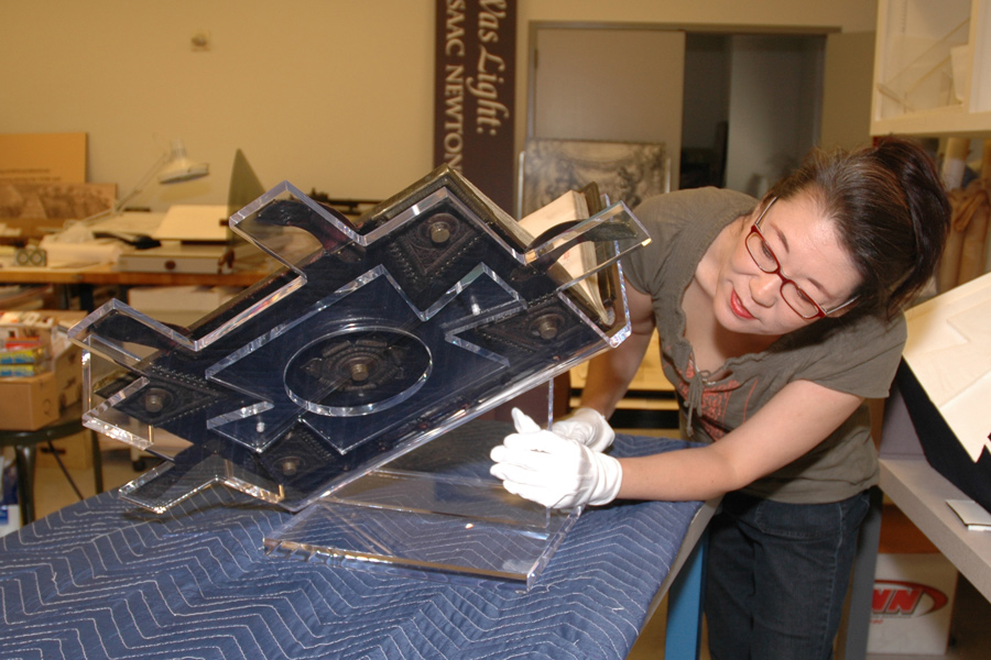 Lauren Tawa checks the back of the cradle. The raised and recessed areas in the cradle's design support the weight of the Gutenberg Bible while protecting the brass ornamentation on the book's cover from direct contact.