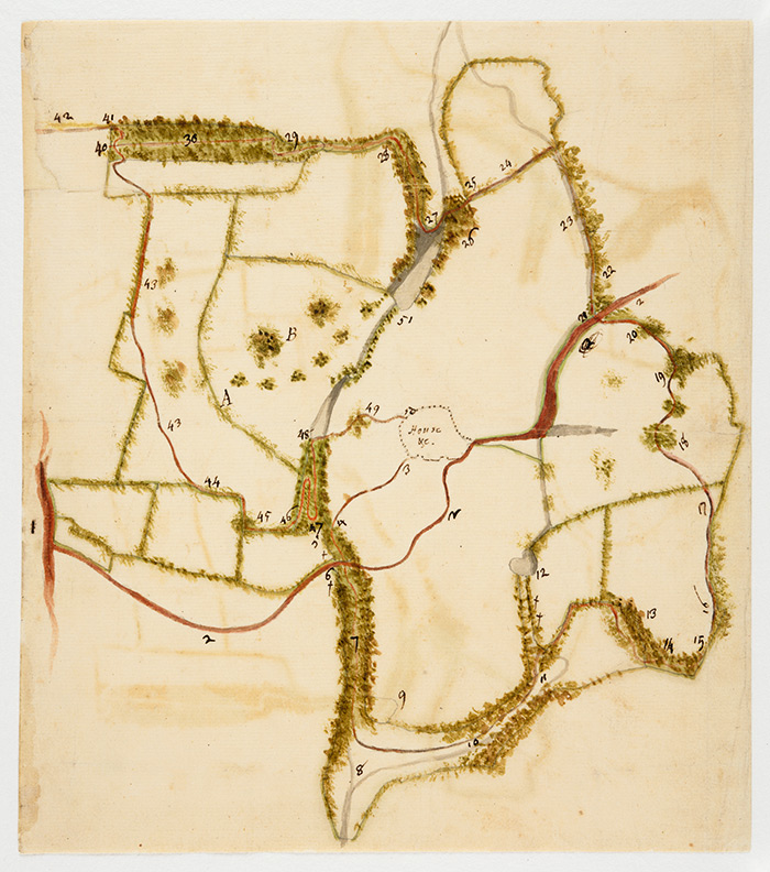 A plan of the Leasowes showing points of interest, accompanying Joseph Spence’s “The Round of Mr Shenstone’s Paradise.” The fight likely took place on one of the wooded walks visitors were meant to follow. The Huntington Library, Art Collections, and Botanical Gardens.
