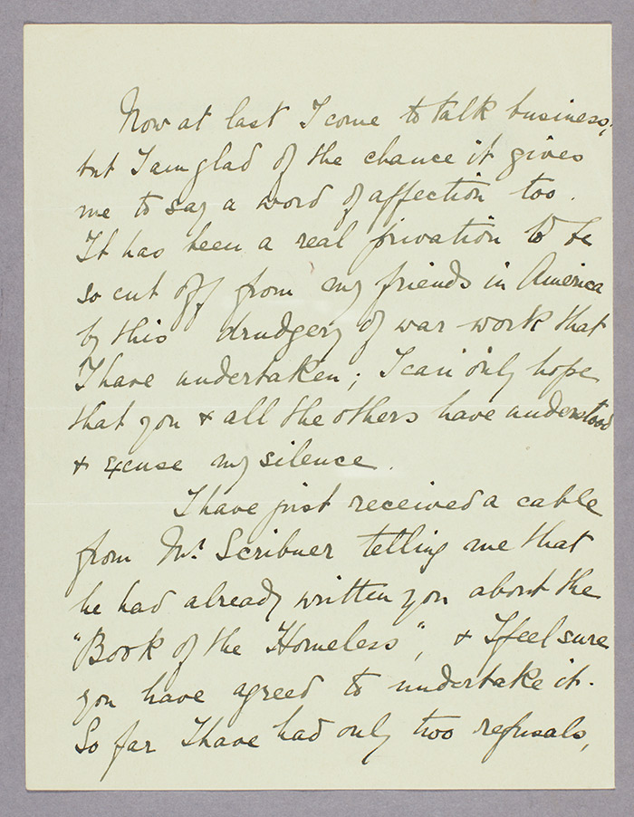 The Huntington holds the corporate archive for the Merrymount Press, extending to 320 boxes, plus ledger volumes and type samples. Among the records is a file of correspondence between Wharton, Scribner, and Updike about the planning and printing of her proposed volume, The Book of the Homeless. The virtue of the cause at hand is apparent throughout the correspondence, as when Updike writes to Wharton on Sept. 10, 1915, “Both on your account, and on account of what the book stands for, I shall do my best with it.”