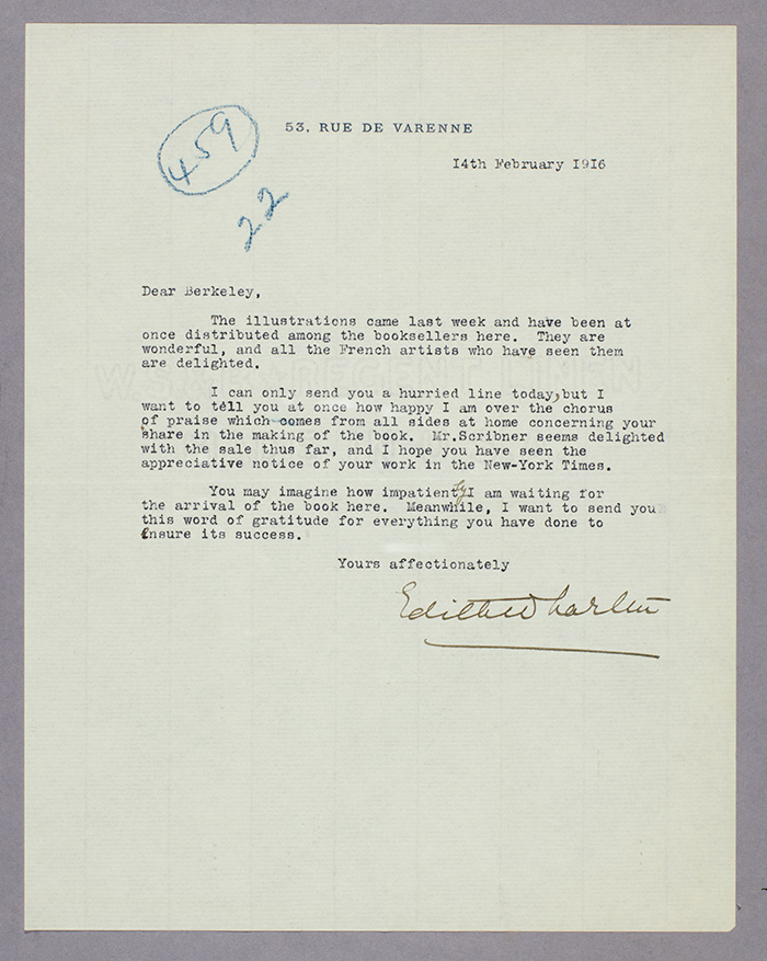 In early 1916, the book appeared to widespread praise. On Feb. 14, Wharton wrote to Updike, “The illustrations . . . are wonderful and the French artists who have seen them are delighted. I want to tell you at once how happy I am over the chorus of praise which comes from all sides at home concerning your share in the making of the book. Mr. Scribner seems delighted with the sales thus far, and I hope you have seen the appreciative notice of your work in The New York Times.”