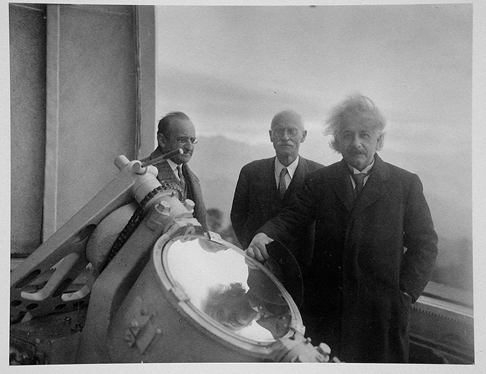 Albert Einstein (right) at the top of the 150-foot solar tower at the Mount Wilson Observatory, with solar physicist Charles St. John (middle) and mathematician Walther Mayer (left). Jan. 29, 1931. The Observatories of the Carnegie Institution for Science Collection at The Huntington Library, Art Collections, and Botanical Gardens.