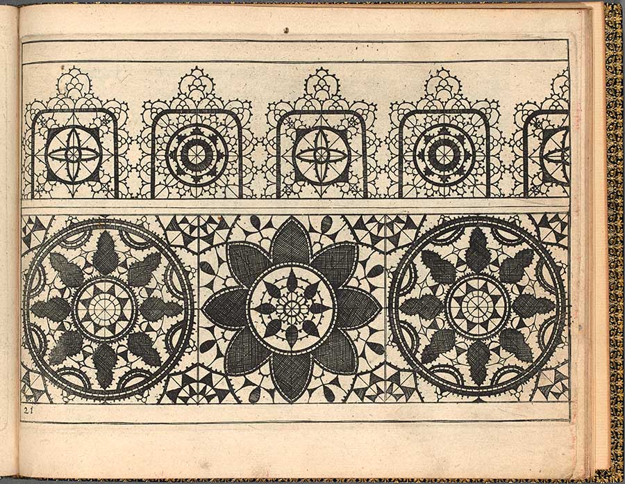 Pinpricks of a needle used to outline a floral image are clearly visible on the verso side of a page of patterns. John Taylor, The Needles Excellency, London: Printed for James Boler, 1634, plate 21 verso. The Huntington Library, Art Collections, and Botanical Gardens.
