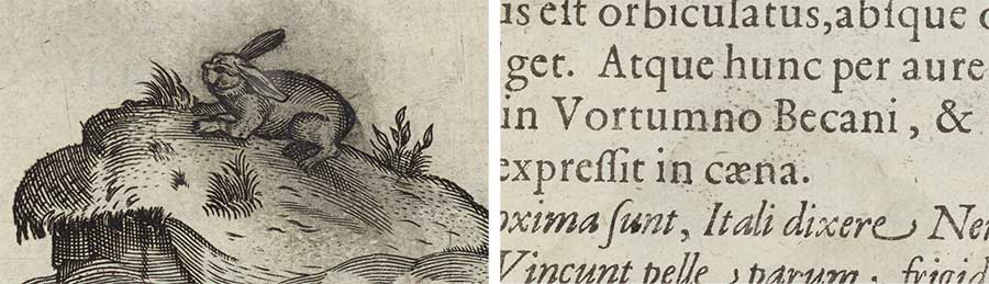 Left: Detail of Crispijn van de Passe's A garden of flowers, Utrecht: by Salomon de Roy, for Crispian de Passe, 1615, page 128 recto. Right: Pinpricks above the "o" in the word "Vortumno" outline the ear of the rabbit on the verso side of the page. The outline of the rest of the rabbit can be discerned amid the Latin text. Detail of Crispijn van de Passe's A garden of flowers, Utrecht: by Salomon de Roy, for Crispian de Passe, 1615, page 128 verso. The Huntington Library, Art Collections, and Botanical Gardens.