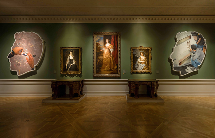 From left to right, Alex Israel, Self-Portrait (Selfie and Studio Floor), 2014, acrylic and bondo on fiberglass; Thomas Hudson, Lady Frances (Finch) Courtenay, ca.1741, oil on canvas; Anthony van Dyck, Anne (Killigrew) Kirke, ca. 1637; Peter Lely, Lady Essex Finch, ca. 1675, oil on canvas; Alex Israel, Self-Portrait (Signature), 2014, acrylic and bondo on fiberglass. Photo by Fredrik Nilsen, courtesy of The Huntington.