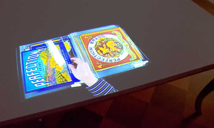 Projected onto a table designed for the installation, the video shows dozens of pairs of hands of people working with and using The Huntington’s rare library materials. There are hands repairing wax seals, hands searching for items in a card catalog, hands marking items in an auction catalog, hands reviewing microfilm, hands mixing paste, hands examining color slides on a light box, hands comparing a manuscript to a book.