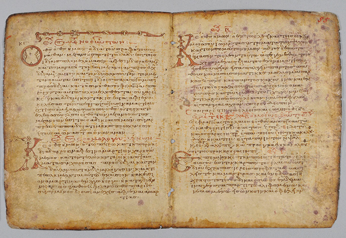 But little is known about what happened to the palimpsest during the 20th century; after Heiberg’s discoveries, it disappeared for decades. What is known is that over these “lost years” some of the pages went missing, mold set in, and illustrations of the evangelists, forged to look medieval, had been painted on some of the pages. There is some suggestion that a book dealer may have added the illustrations to make the Palimpsest more marketable. Eventually, the book was put up for auction and sold in 1998. The buyer then turned around and handed it to the Walters Art Museum in Baltimore for conservation, imaging, and transcription, a painstaking process taking the better part of 12 years.