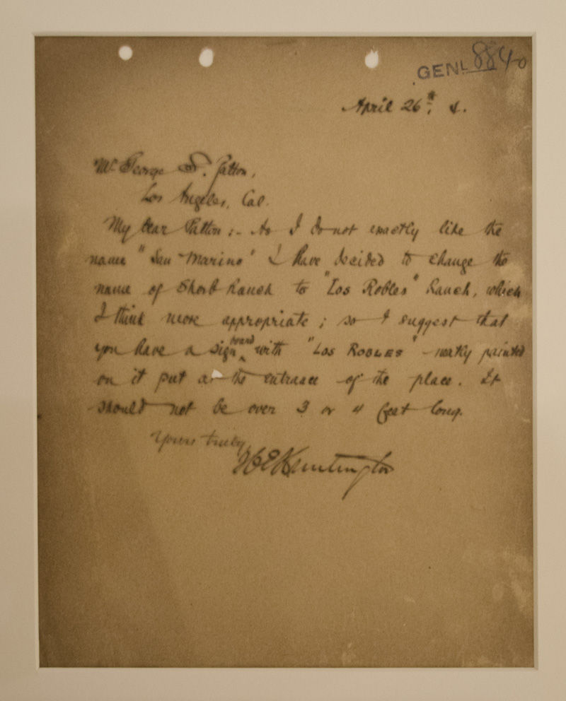 My dear Patton: As I do not exactly like the name “San Marino” I have decided to change the name of Shorb Ranch to “Los Robles” Ranch, which I think more appropriate; so I suggest that you have a sign board with “Los Robles” neatly painted on it put at the entrance of the place. It should not be over 3 or 4 feet long.