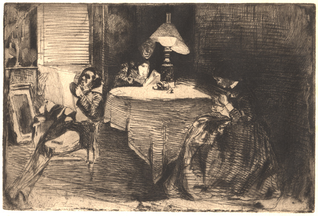 Lobis draws your eye to Whistler's technique: "It's an interesting depiction of light and shadow. The light from the lamp is described through an absence of line. Darkness is made with dense hatching and cross-hatching. He also creates a very heavy interpersonal atmosphere. Both Whistler and Haden were interested in portraying atmosphere, in describing the invisible and intangible qualities of space and time."