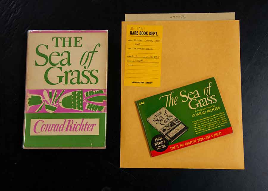 The colorful original cover artwork of Conrad Richter’s Sea of Grass (left) is reproduced in monochrome on the cover of the standard layout of the Armed Services Edition of the same work (right). The Huntington Library, Art Collections, and Botanical Gardens. Photo by Deborah Miller.