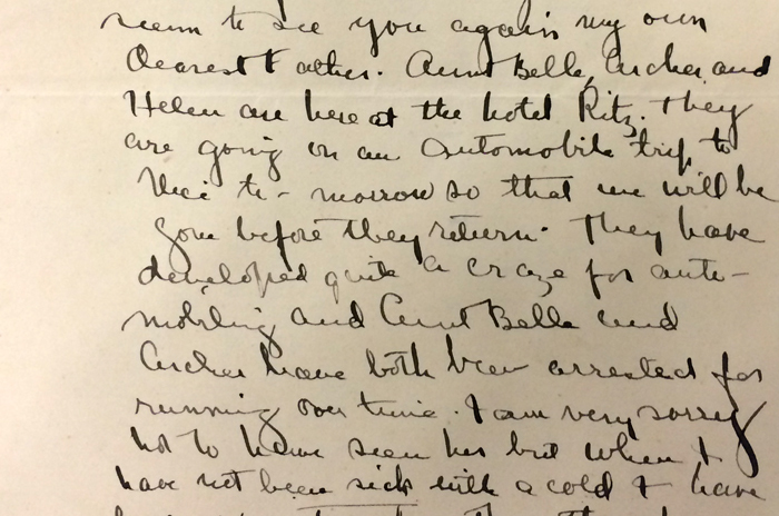 A 1901 letter from Marian Huntington to her father, Henry E. Huntington, in which she mentions that Henry’s wife, Arabella, and Arabella's son, Archer, have received speeding tickets while driving outside of Paris, France.