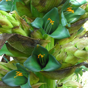 Puyas bloom from late winter throughout the spring,and come in a variety of spectacular colors, including brilliant yellow, teal blue, royal blue, green, purple, and near black. Amazingly, all puyas have a very special characteristic—after they bloom, their petals twist together, perhaps to protect the ovary from cold and insects.