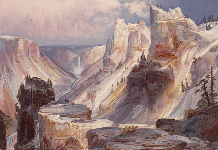 Thomas Moran, “Grand Canyon of the Yellowstone,” chromolithographic reproduction of a watercolor sketch as published in Ferdinand V. Hayden, The Yellowstone National Park, and the mountain regions of portions of Idaho, Nevada, Colorado and Utah. Boston, 1876. The Huntington Library, Art Collections, and Botanical Gardens.