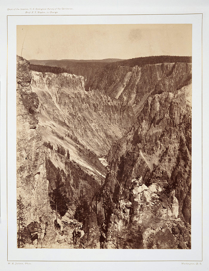 William Henry Jackson, vintage photograph of Yellowstone National Park’s Grand Canyon, from photo album of Yellowstone National Park and views in Montana and Wyoming territories, 1873. The Huntington Library, Art Collections, and Botanical Gardens.