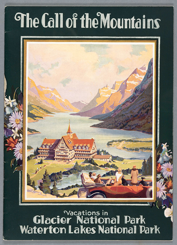 Other items from The Huntington’s collections include brochures, posters, and guidebooks that demonstrate the role of private enterprise in the parks’ development. Documents show how the Northern Pacific Railroad, which early on recognized the importance of rail service to Yellowstone, pushed for the early protection of the park. The railroad also advertised the rugged mountains and spectacular lakes of Glacier National Park in its poster titled The Call of the Mountains.