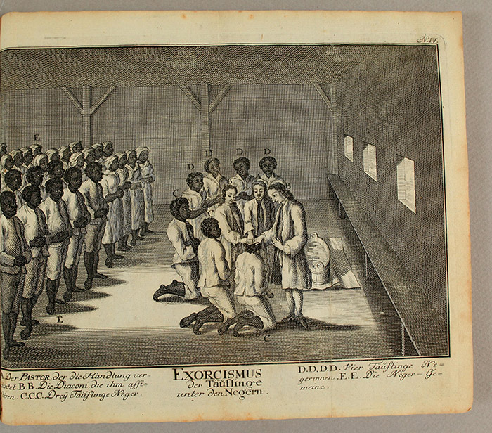 Exorcismus der Täuflinge unter den Negern. Plate IV. From David Cranz. Short, reliable news of the Church Unitas Fratrum. Halle, 1757. John Carter Brown Library.