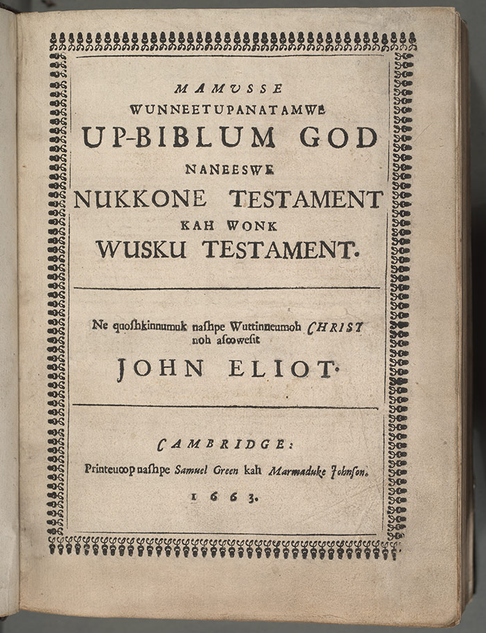 Mamusse wunneetupanatamwe Up-Biblum God [Bible in Massachusett]. Cambridge, Mass., 1663. The Huntington Library, Art Collections, and Botanical Gardens.