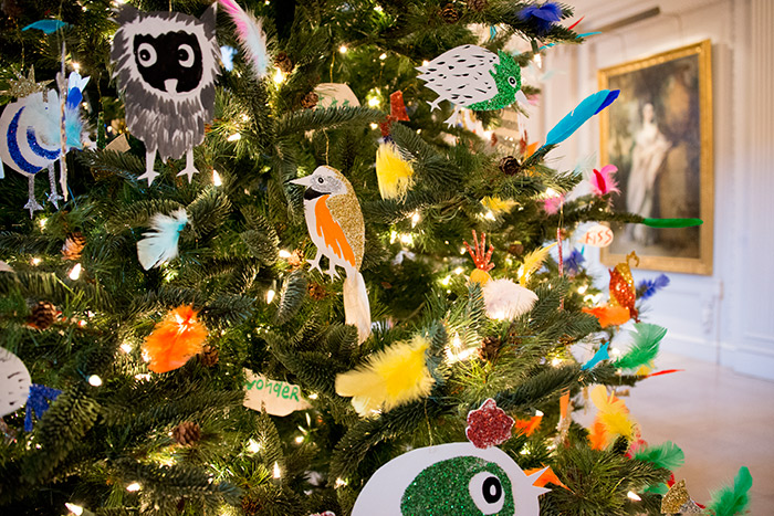 The tree’s creator, Konstantin Kakanias, is a painter and multimedia artist who lives in Los Angeles. His work is often whimsical, as with the tree. He contributes drawings to the New York Times and has worked for Vanity Fair and Vogue, as well as for Yves Saint Laurent and Tiffany. But he’s not too haute couture to work with construction paper and glitter. And he got some help. To cut and decorate the 200 little birds on the tree, Konstantin enlisted students from Art Division, a nonprofit based in the Rampart area of L.A. that’s dedicated to training and supporting underserved Los Angeles youth studying visual arts.