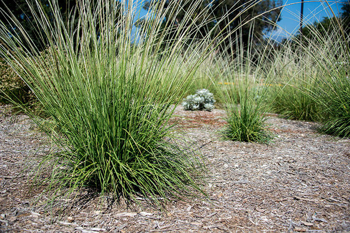 For gardeners not concerned with low or walkable surfaces, a huge variety of low-water use bunch grasses are available and can be complemented by trees, shrubs, and seating areas. Many of these grasses retain their flower stems for a large part of the year and are stunning when backlit. California native deergrass is one of the easiest to grow and most beautiful. You can see it in a variety of areas around the Education and Visitor Center, including the bus drop-off area on the east side of the center. It’s best to use plugs, 4-inch pots, or one-gallon pots, planted 4 to 5 feet apart. Five feet allows for the fullest expression of this plant’s beautiful flower stocks, while four feet gives a fuller clump of foliage. It grows quickly and should be cut back every few years to keep it looking clean and to stimulate growth. Even though it’s a low-water plant, deergrass can tolerate water, making it a good choice in transition areas between a lawn and a low-water landscape. Once established, it continues to look good with water only once a month in the dry season.