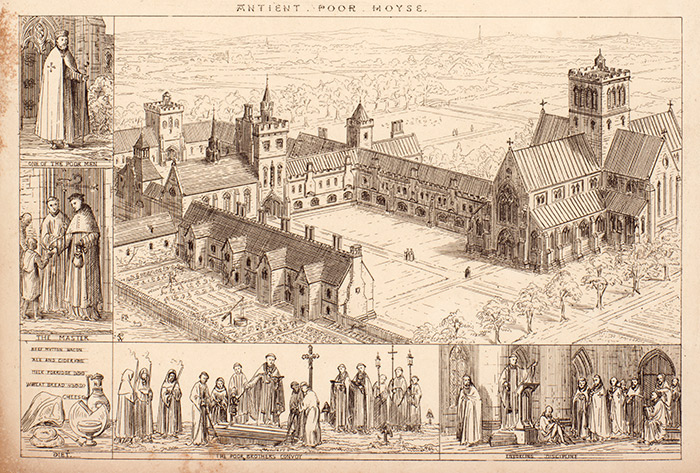 The Ancient Poor House, as depicted by Pugin, was a magnificent almshouse built around a courtyard with an impressive church anchoring the whole complex. Paupers were treated with dignity, receiving clothing and a substantial meal of beef, mutton, bacon, ale and cider, milk and porridge, and bread and cheese. Detail from Pugin’s “Contrasted Residences for the Poor: Modern Poor House; Ancient Poor House.” The Huntington Library, Art Collections, and Botanical Gardens.