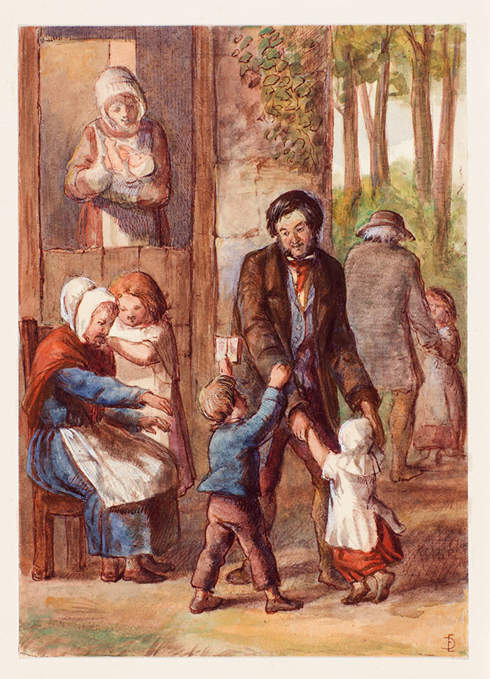 For instance, Edward Gurden Dalziel’s watercolor Children are the Poor Man’s Riches (inspired by the English proverb) emphasized what many destitute parents faced in the mid-19th century—having to bring their children with them into the workhouses to provide for the family. Dalziel’s tender portrait of a poor but happy family would have clearly contrasted with the appalling conditions that the government provided to the marginalized members of British society.