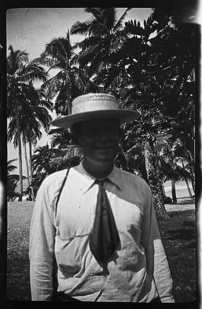 Jack London in Samoa, wearing a straw hat. Photo attributed to Charmian London, 1908. The Huntington Library, Art Collections, and Botanical Gardens.Related content on Verso: