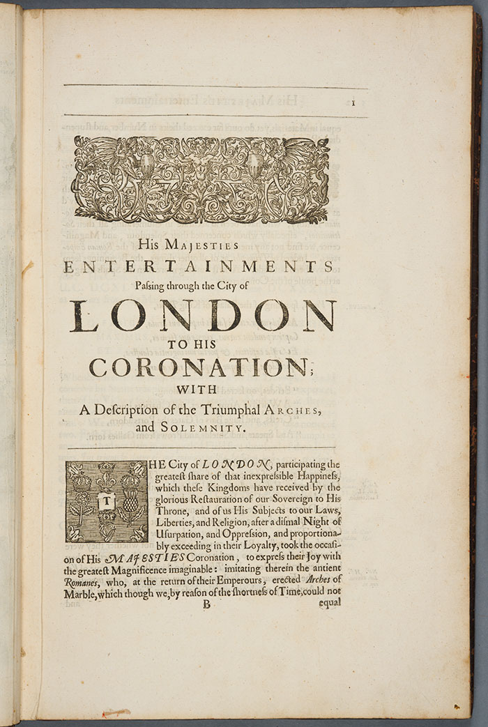The first page of Ogilby’s lavishly illustrated memorial of Charles II’s Coronation procession: The Entertainment of His Most Excellent Majestie Charles II, in His Passage through the City of London to His Coronation (London, 1662). The Huntington Library, Art Collections, and Botanical Gardens.