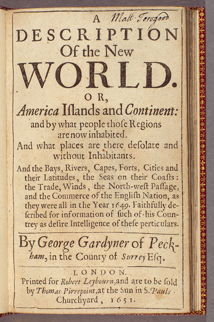 The title page of John Gardyner’s far less rosy picture of England’s colonies: A Description of the New World (London, 1651). The Huntington Library, Art Collections, and Botanical Gardens.