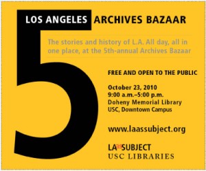 This Saturday USC Libraries play host to the fifth annual Los Angeles Archives Bazaar. The Huntington was the site of the first bazaar in 2006, when 30 historical collections and archives exhibited photos, pamphlets, and other primary documents from their collections. Saturday, more than 70 exhibitors will be on hand, including L.A.-area universities, libraries, museums, and community organizations. The event is free and open to the public and is presented by the L.A. as Subject Archives Forum.